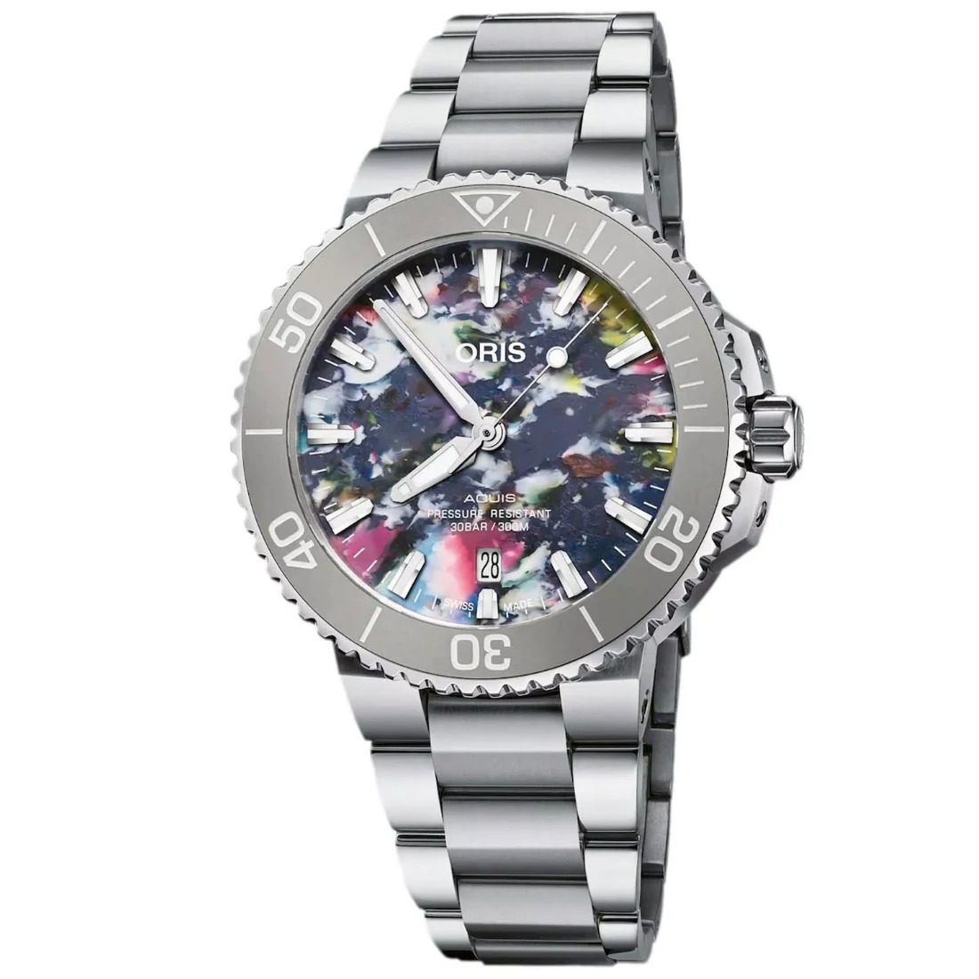 REFERENCIA 01 733 7766 4150-Set CAJA Aquis, 41.50 mm, 1.634 pulgadas, Acero MATERIAL Anillo superior multipiezas acero inoxidable, escala minutera cerámica DIMENSIONES 41.50 mm, 1.634 pulgadas CRISTAL SUPERIOR Zafiro, ambas caras abombadas, capa interior antirreflejos FONDO CAJA Acero inoxidable, atornillado, cristal mineral transparente DISPOSITIVOS OPERATIVOS Corona atornillada seguridad acero inoxidable ESTANQUEIDAD 30 bar ANCHURA ENTRE ASAS 22 mm