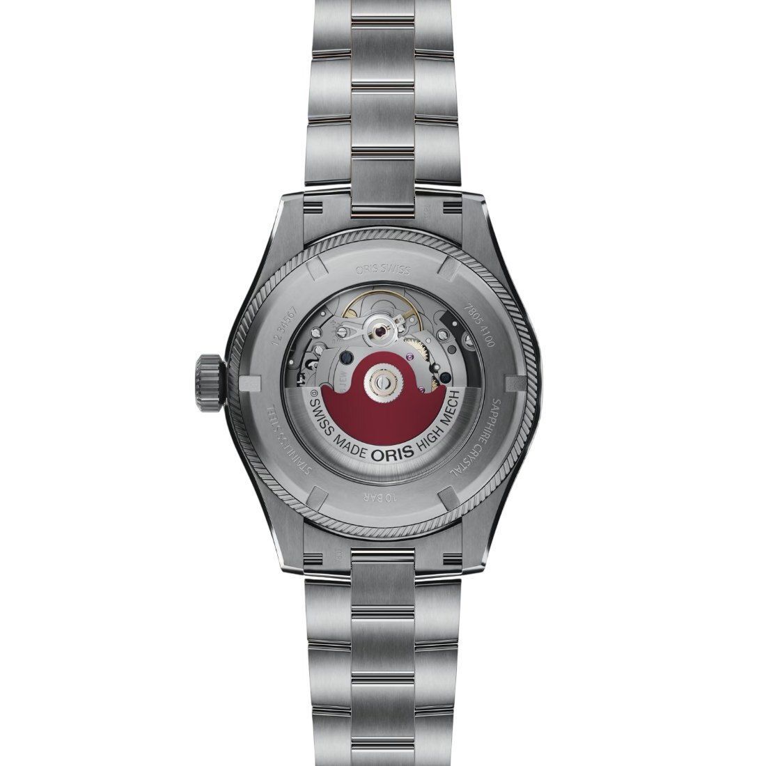 Caja de acero. Zafiro, ambas caras abombadas, capa interior antirreflejos. Acero inoxidable, atornillado, cristal mineral transparente. Diámetro: 41.00 mm, Hermeticidad: 10 bar, Anchura entre cuernos: 20 mm