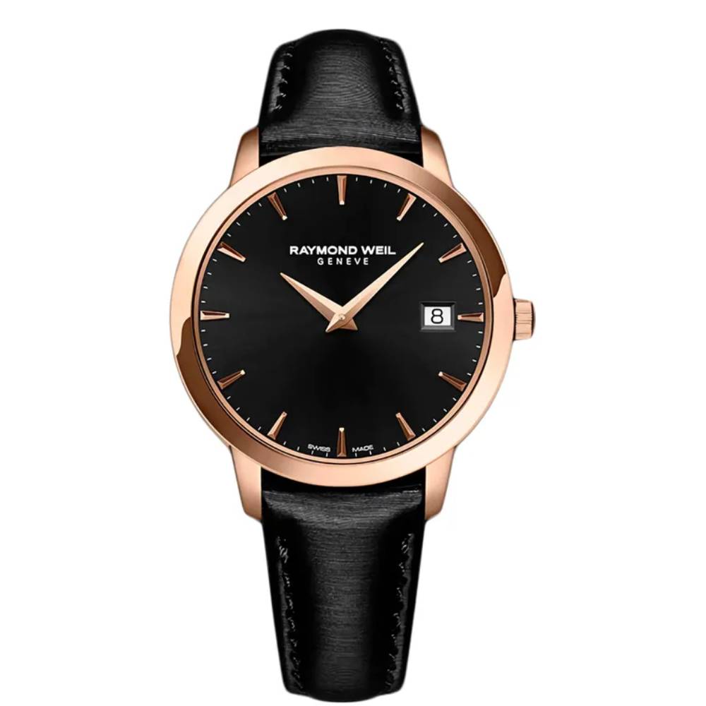 Raymond Weil, fundada en Ginebra, Suiza, en 1976, marca líder de tradición relojera, ha impreso en éste modelo Toccata, una línea tradicional, al tiempo moderna y cien por ciento funcional. Para mujeres de gustos clásicos pero con un estilo de vida dinámico, sin descuidar una estética profundamente femenina en la combinación de piel en color negro y oro rosado.
