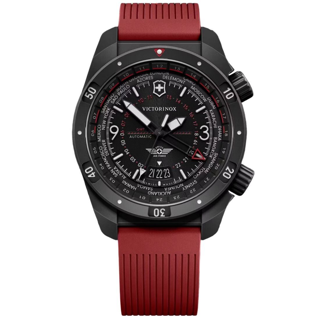 Características clave El Air Pro automático es un reloj preparado para el vuelo, fabricado con precisión y resistencia. Su esfera tridimensional permite seguir hasta tres husos horarios, con el segundo huso horario indicado mediante una manecilla GMT específica. Accionado por el movimiento automático Swiss Made Sellita SW330-2 con una reserva de marcha de 56 horas, cuenta con dos coronas: una corona enroscada a las 4 horas para la hora y otra a las 2 horas para las funciones GMT. Ofrece resistencia ISO a los golpes y al agua hasta 200 m, además de manecillas y marcadores sobredimensionados rellenos de Super-LumiNova® suiza.