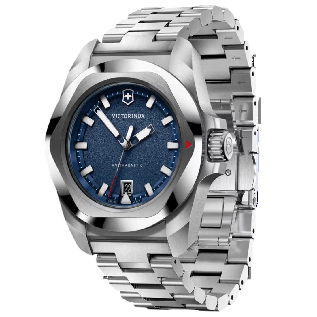 Características clave Un tributo moderno al legado de la Swiss Army Knife™: este reloj fusiona historia y vanguardia con una esencia propia de diseño. El reloj I.N.O.X. Cuarzo, diseñado y fabricado en Suiza, combina la precisión con la funcionalidad cotidiana. Presenta una esfera mate con índices en relieve y manecillas luminosas que facilitan la lectura de día y de noche, además de un indicador de fecha a las 6. El bisel cepillado y pulido añade refinamiento, mientras que el sistema de brazalete de metal intercambiable asegura un uso versátil y cómodo.