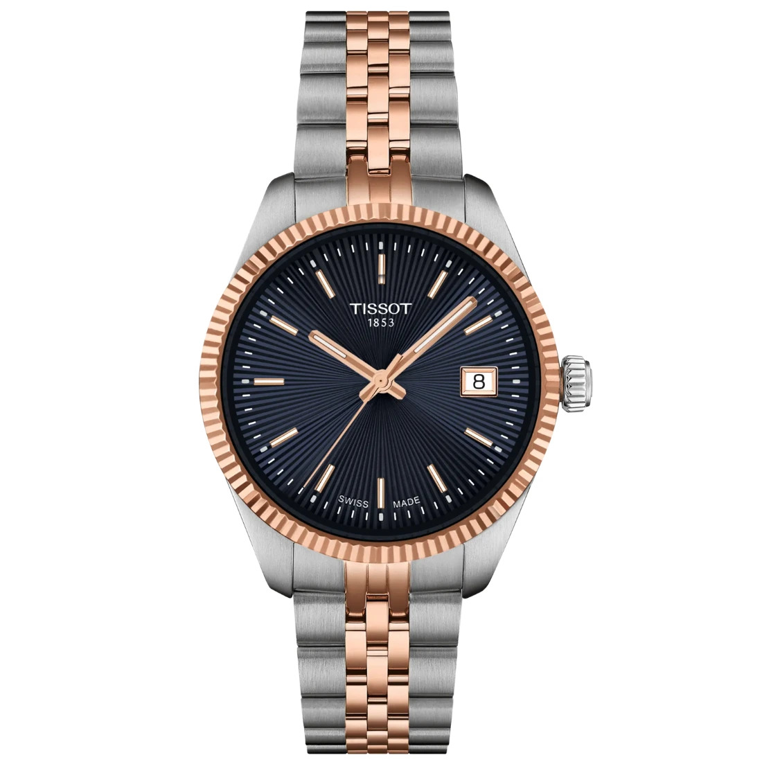 Referencia de la correa/cadena: T605050371 Detalles de la correa: Acero Inoxidable Recubrimiento del brazalete: PVD Color de la correa: Gris, Oro rosa 5n Cierre: Cierre de mariposa con pulsadores, Pulsera intercambiable de fácil apertura